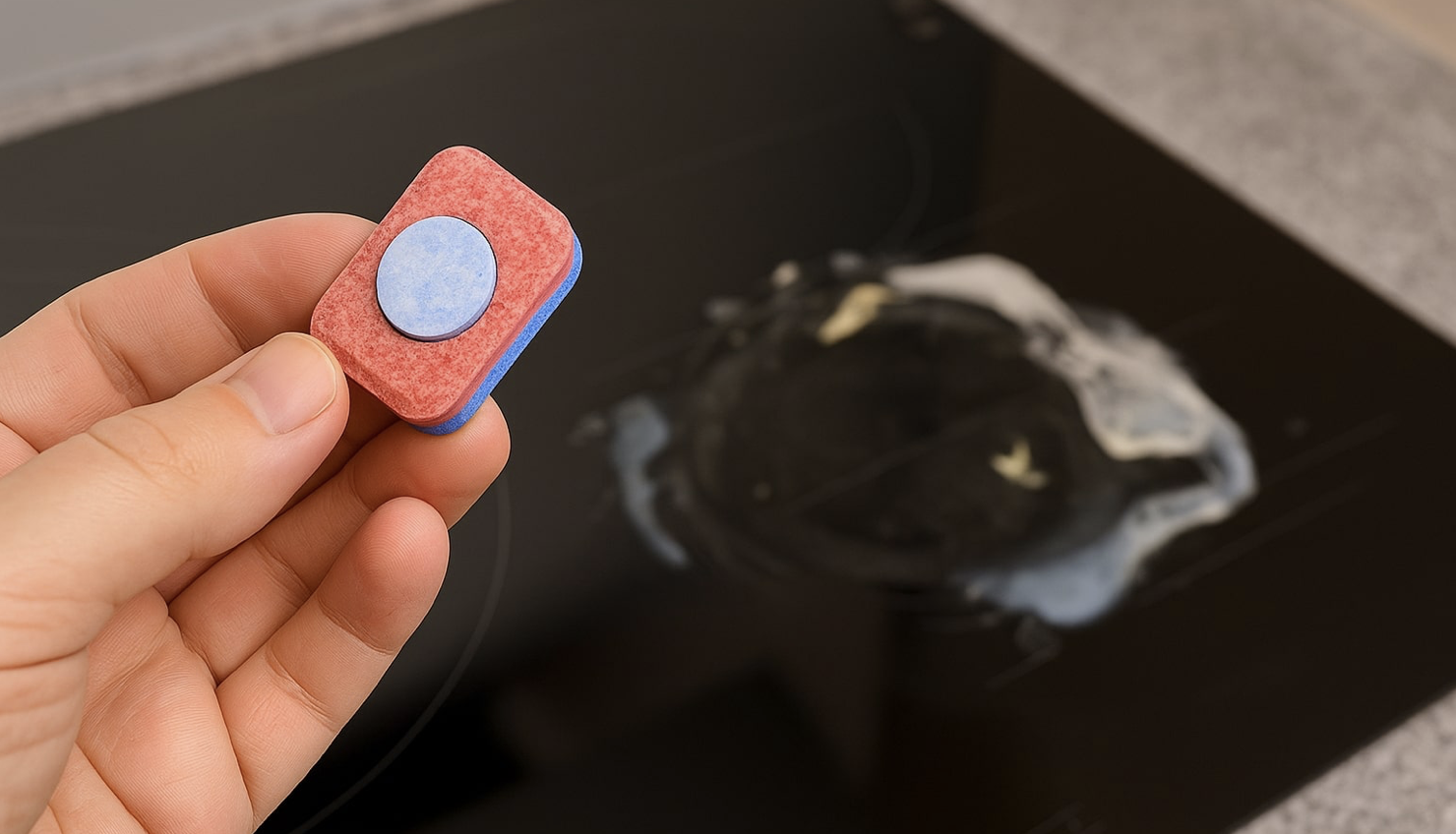 Muitas pessoas raspam, esfregam com força ou usam produtos químicos agressivos no fogão, na esperança de remover rapidamente as manchas queimadas. Infelizmente, isso pode danificar a superfície, espalhar ainda mais a sujidade ou simplesmente não resultar. Mesmo produtos muito fortes falham muitas vezes em amolecer a crosta dura que se forma quando algo transborda e queima. A pastilha da máquina de lavar loiça funciona de outra maneira. Em vez de químicos agressivos, liberta enzimas, desengordurantes e agentes de limpeza de forma gradual, permitindo que a sujidade se desfaça sem necessidade de esfregar. Mas isto só resulta se a pastilha for dissolvida primeiro. Esfregá-la diretamente no fogão faz pouco efeito e pode riscar a superfície.